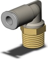 Compact male elbow fitting: Ø4 tubing, R1/8, brass with sealant, oval release button. Ideal for precise connections.
