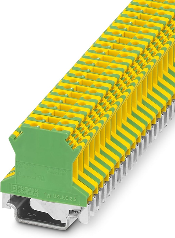 USLKG 35 - Ground terminal, Use an NS 32... or NS 35... copper DIN rail for connection cross sections of 35 mm2/2 AWG. Use an NS 32... copper DIN rail for connection cross sections > 35 mm2/2 AWG. When aligning with a feed-through terminal block of the same shape, a cover must be used for insulation voltages > 690 V., number of connections: 2, connection method: Screw connection, Rated cross section: 35 mm2, cross section: 0.75 mm2 - 50 mm2, mounting: PE foot with mounting screw, M5, mounting type: NS 35/7,5, NS 35/15, NS 32, color: green-yellow