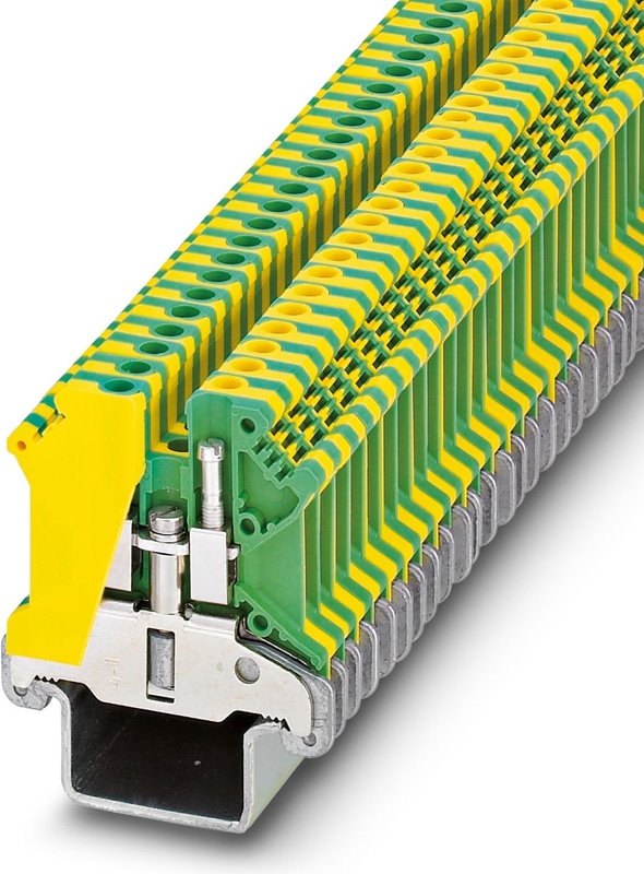 USLKG 35-1 - Ground terminal, Use an NS 35/15-2.3 copper DIN rail for connection cross sections >= 35 mm2/2 AWG. When aligning with a feed-through terminal block of the same shape, a cover must be used for insulation voltages > 690 V., number of connections: 2, number of positions: 1, connection method: Screw connection, cross section: 0.75 mm2 - 50 mm2, mounting: PE foot with mounting screw, M5, mounting type: NS 35/15-2,3, color: green-yellow