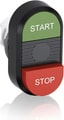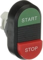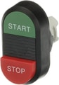 The MPD15-11B Double Pushbutton is: Momentary - Flush/Extended - Green/Red Actuator - Non-illuminated - Black Plastic - No contact block - Red - Red - STOP - START