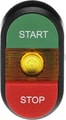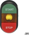 The MPD15-11Y Double Pushbutton is: Maintained - Flush/Extended - Green/Red Actuator, Yellow Indicator - Illuminated - Black Plastic - No contact block - Red - Red - STOP - START