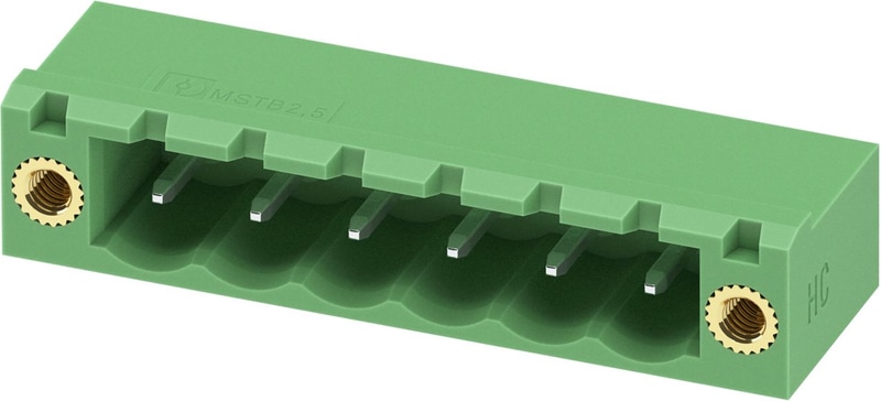 PCB headers, nominal cross section: 2.5 mm2, color: green, nominal current: 16 A (see derating curve), rated voltage (III/2): 320 V, contact surface: Tin, contact connection type: Pin, number of potentials: 6, number of rows: 1, number of positions: 6, number of connections: 6, product range: MSTB 2,5 HC/..-GF, pitch: 5 mm, mounting: Wave soldering, pin layout: Linear pinning, solder pin [P]: 3.23 mm, number of solder pins per potential: 1, plug-in system: COMBICON MSTB 2,5 HC, Pin connector pattern alignment: Standard, locking: Screw locking mechanism, mounting: Threaded flange, type of packaging: packed in cardboard