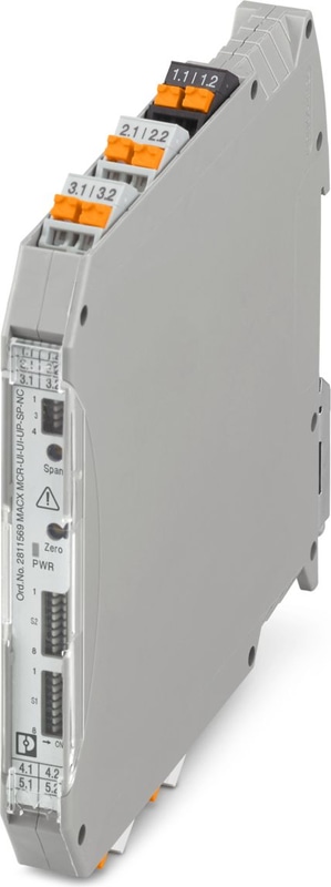 Isolating amplifier with safe electrical isolation and wide-range power supply (24 V ... 230 V AC/DC). DIP switches on the front, over 1600 signal conversions can be set. Standard configuration (IN 0 ... 10 V/OUT 0 ... 20 mA), spring-cage connection, SIL.