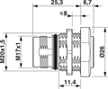 ST-7ES1N8ACK04S - Panel feed-through, straight, SPEEDCON, M17, number of positions: 7+PE, contact connection type: Socket, Flat gasket, 4x Ø 3.2, shielded: yes, flange dimensions: 25.75 mm x 25.75 mm, degree of protection: IP67, cable diameter range: 9 mm ... 11 mm, number of positions: 8, connection method: Crimp connection, series: ST, Alternative product in accordance with RoHS II without Exemption 6c (Pb < 0.1 %) item no.: 1243329