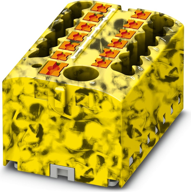 PTFIX 6/12X2,5-FE - Distribution block, Basic terminal block with supply, nom. voltage: 450 V, nominal current: 24 A, number of connections: 13, connection method: Push-in connection, Load contact, cross section: 0.14 mm2 - 4 mm2, Push-in connection, Line contact, Rated cross section: 6 mm2, cross section: 0.5 mm2 - 10 mm2, mounting type: for snapping onto a DIN rail adapter, Direct mounting with flange, Free-hanging, color: black/yellow