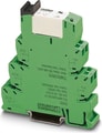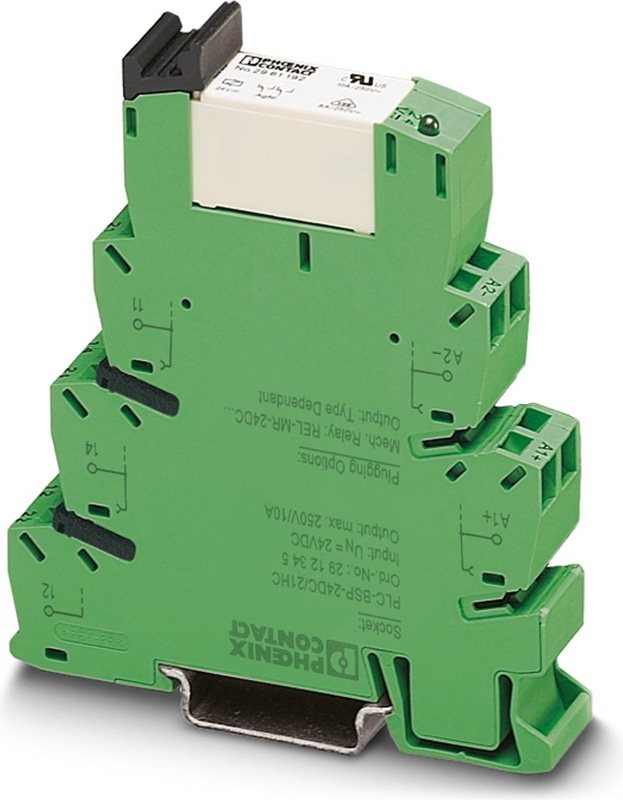 PLC-INTERFACE for high continuous currents, consisting of PLC-BSP.../21 HC basic terminal block with spring-cage connection and plug-in miniature relay, for mounting on DIN rail NS 35/7,5, limiting continuous current up to 10 A, 1 changeover contact, input voltage 24 V AC/DC