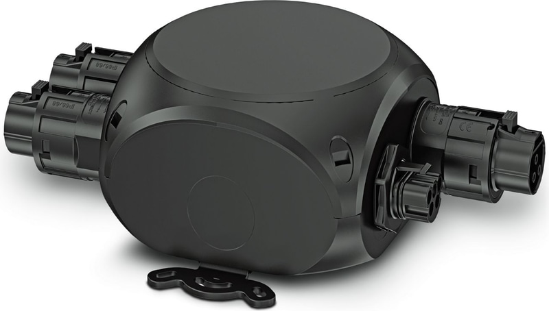 H distributor, Range of articles: PRC 35, design: H-distributor, housing material: Polycarbonate fiber reinforced, color: black, rated voltage: 400 V, rated current: 32 A, Connection method: Preassembled, Contact connection type: Input: pin / outputs: socket, Alternatively, this item can be wired. For your specific requirements, please contact your local PHOENIX CONTACT subsidiary.