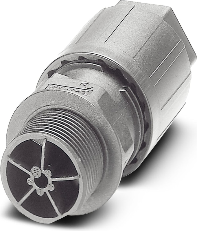 Panel feed-through, product family: QPD, connection method: Spade connection (For slip-on sleeves according to DIN 46247-2)/ IDC connection, number of positions: 4+PE, M25, Pin, 1 mm2 ... 2.5 mm2, 690 V, 20 A, PA, gray, with QUICKON nut, coding: coded, external cable diameter: 9 mm ... 16 mm