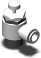 Compact elbow flow control valve with 1/2 port, Ø10 tube, meter-out control, and hex lock nut sealant.