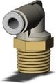 Compact male elbow fitting, Ø3.2 tubing, R1/8 screw, brass with sealant, no release button.