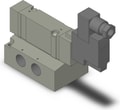 4/5-port solenoid valve, base-mounted, internal pilot, 110VAC, NPT thread, light surge suppressor.