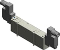 5-port solenoid valve, closed center position, base ported, 24VDC voltage, DIN connector.