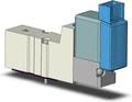 Compact 5-port solenoid valve, 24VDC voltage, base-mounted design with surge suppressor and CE marked.