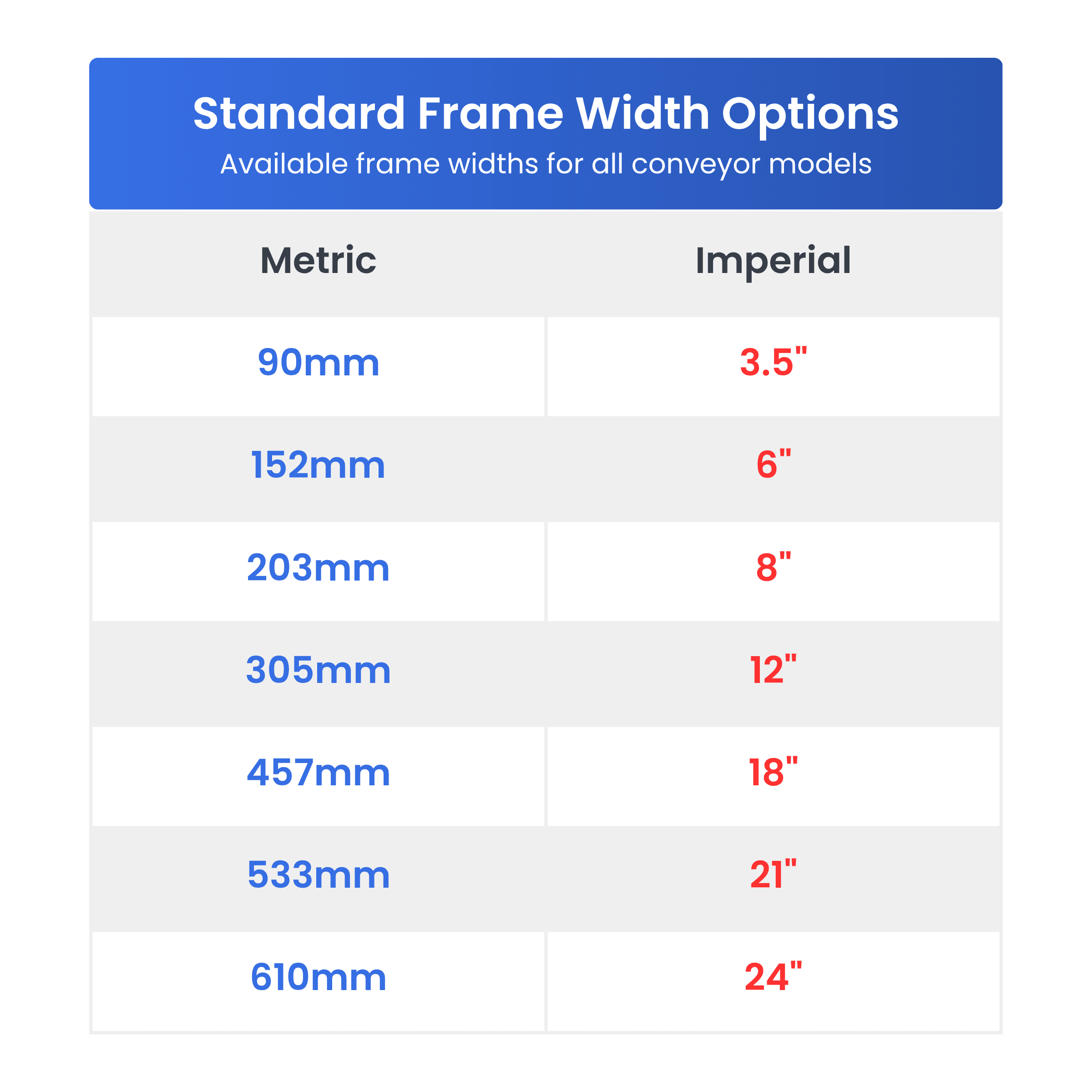 Versatile sizing options ensure the perfect fit for your application. Seven standard frame widths accommodate everything from compact workstations to large-scale production lines.